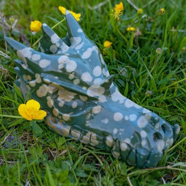 Lunarity our largest skull made of Snakeskin Jasper arrived the following year who helps with past life healing and then Rafundus our 10 inch black obsidian Dragon Skull.